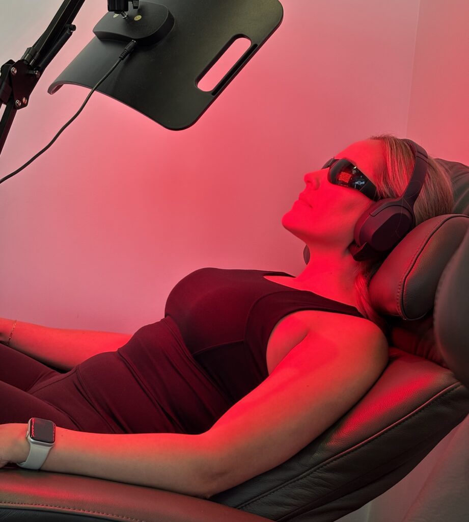 Clothing that allows red and near-infrared light to reach your skin (think shorts and a tank). Some are comfortable wearing less or nothing at all — it’s a completely private room, so up to you!